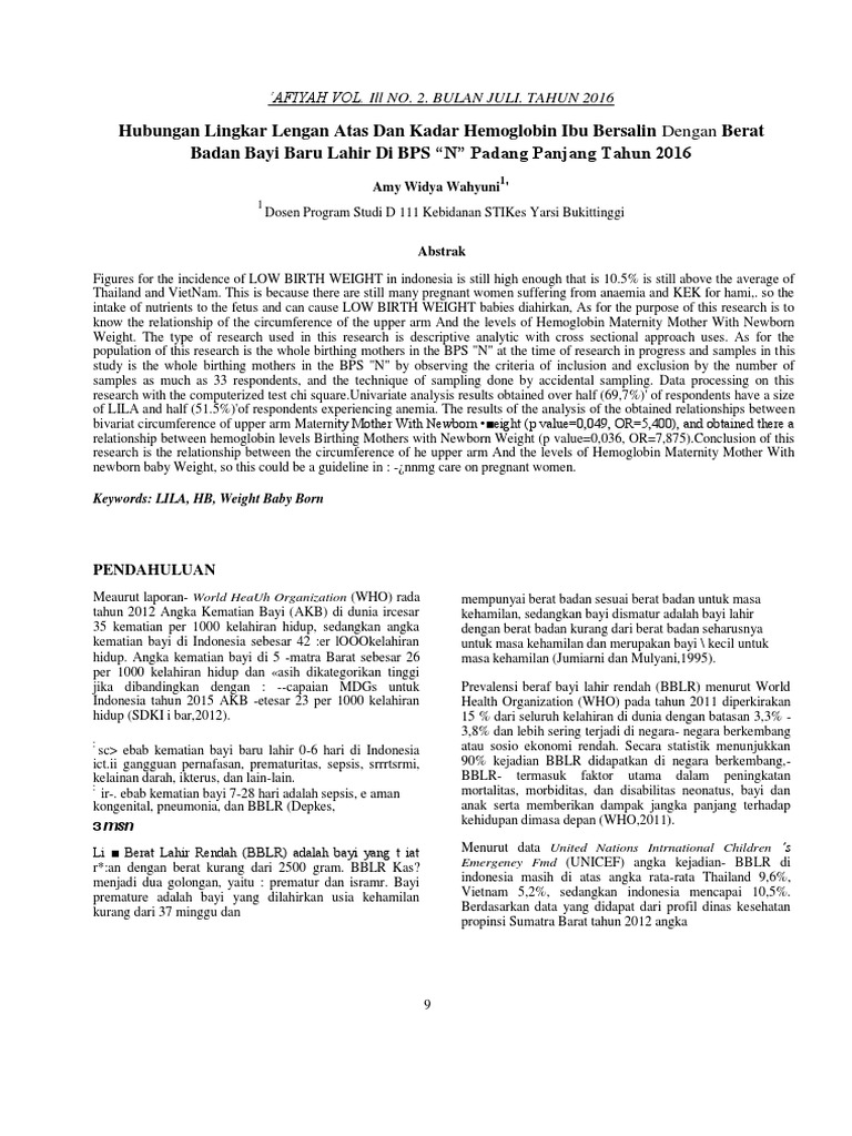 Hubungan Lingkar Lengan Atas Dan Kadar Hemoglobin Ibu Bersalin Dengan Berat Badan Bayi Baru Lahir Di Bps N Padang Panjang Tahun 2016 Human Development Health Sciences